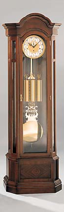 Часы – витрина, корпус выполнен в античном орехе, передняя дверь и боковые стороны из хрустального ограненного стекла позволяют наблюдать работу механизма, круглый арабский циферблат с накладными цифрами и дополнительным секундным циферблатом, лирообразный маятник.